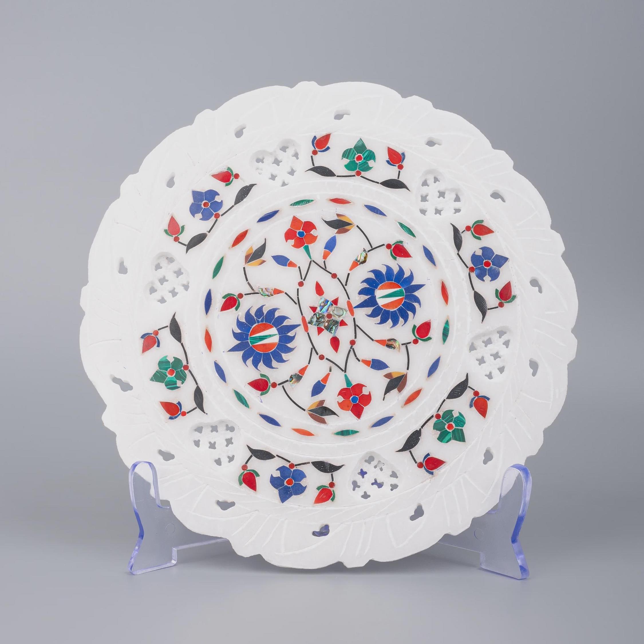 Each plate is carefully crafted by skilled artisans who place tiny pieces of colorful stones into carved marble to create intricate floral patterns. This centuries-old art form is famously seen in the decorations of the Taj Mahal and continues to be practiced by artisans in Agra today.