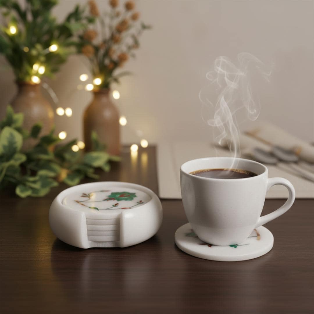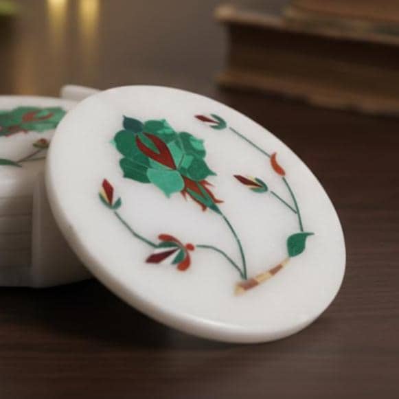 Add Artisanal Elegance to Your Coffee Table Transform your living space with our Handcrafted White Marble Inlay Coasters. This set of six is not just a functional accessory; it is a piece of art created using the ancient Pietra Dura technique—the same stone inlay art seen on the Taj Mahal.