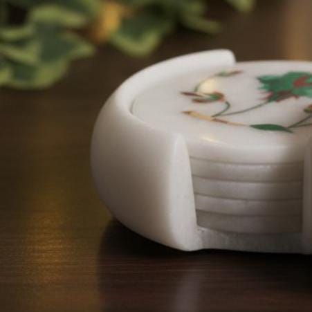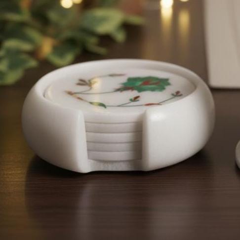 Each coaster is meticulously carved from high-quality white marble and inlaid with vibrant green and red stones to form a delicate floral pattern. Complete with a matching solid marble holder, this set keeps your surfaces protected while adding a sophisticated, "aesthetic" touch to your home.