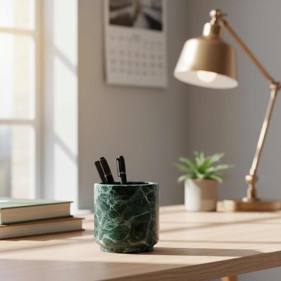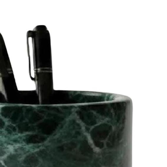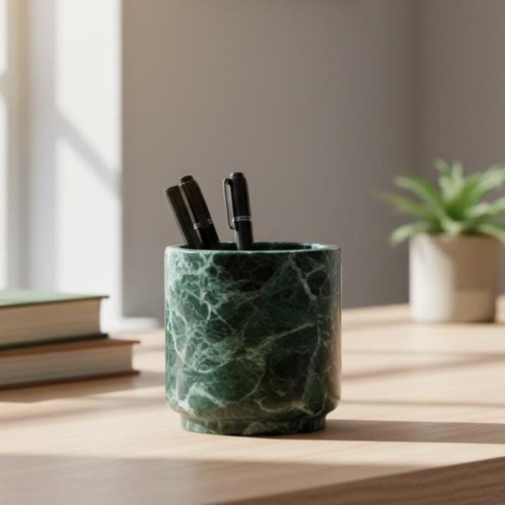 Luxury Organization for Your Modern Workspace Elevate your desk or vanity with our Handcrafted Green Marble Pen Holder. Carved from genuine natural stone, this piece features a soft, light green hue with stunning white veining that adds an instant touch of "aesthetic" luxury to any room.