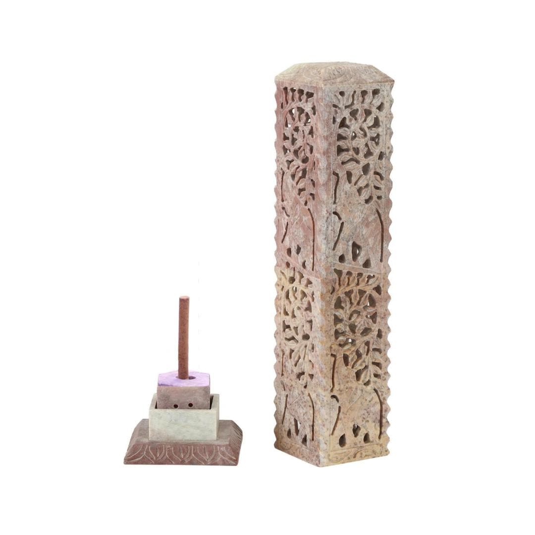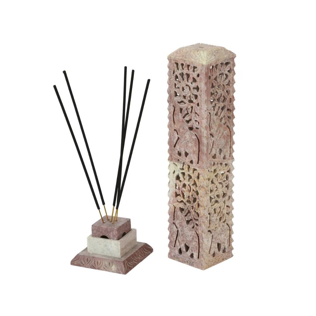 Handmade Soapstone Incense Burner Tower 11" - Carved Elephant Incense Stick Holder & Candle Stand - Boho Home Decor Gift