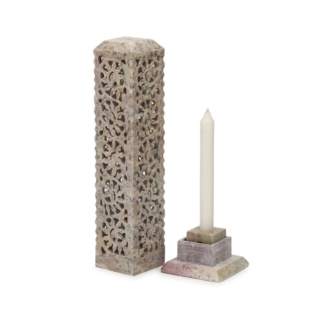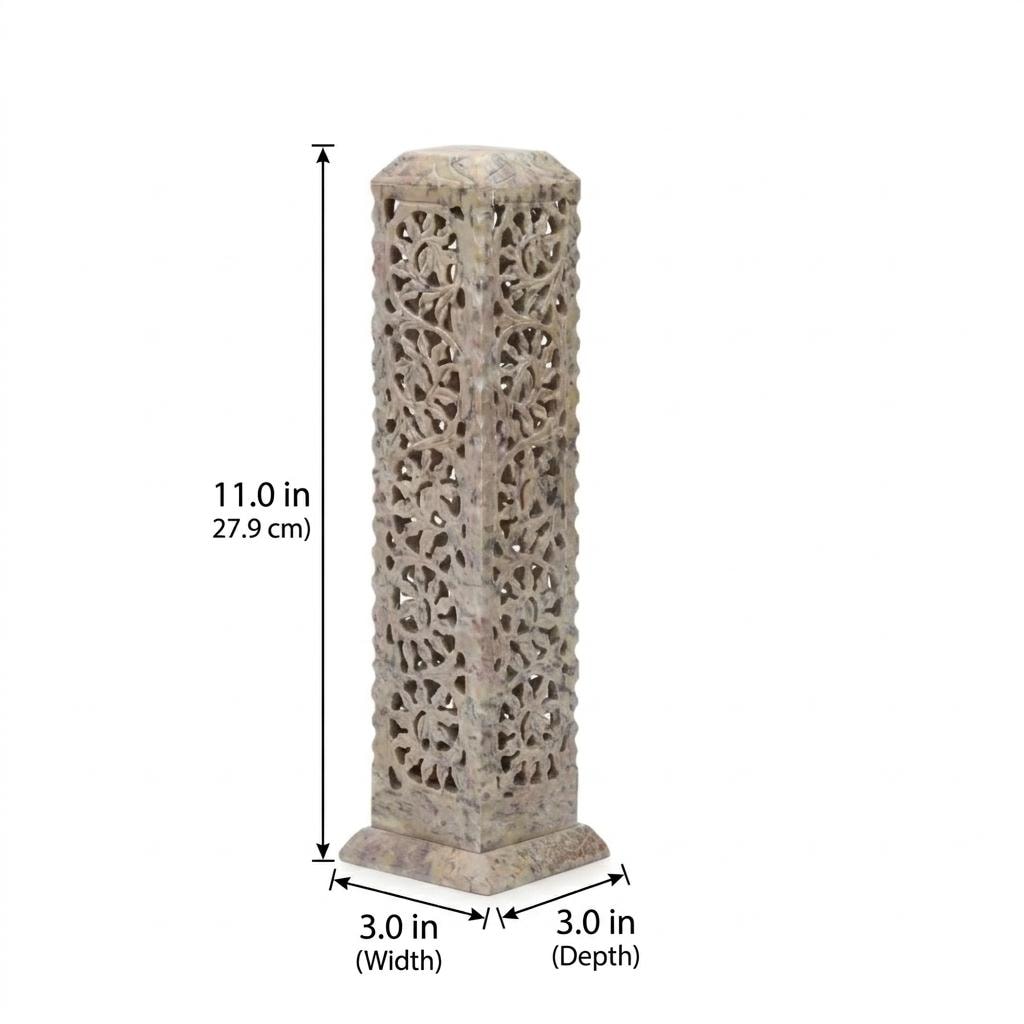 Hand Carved Soapstone Incense Burner Tower, 11" Floral Jali Stone Candle Holder, Boho Home Decor, Tall Spiritual Gift