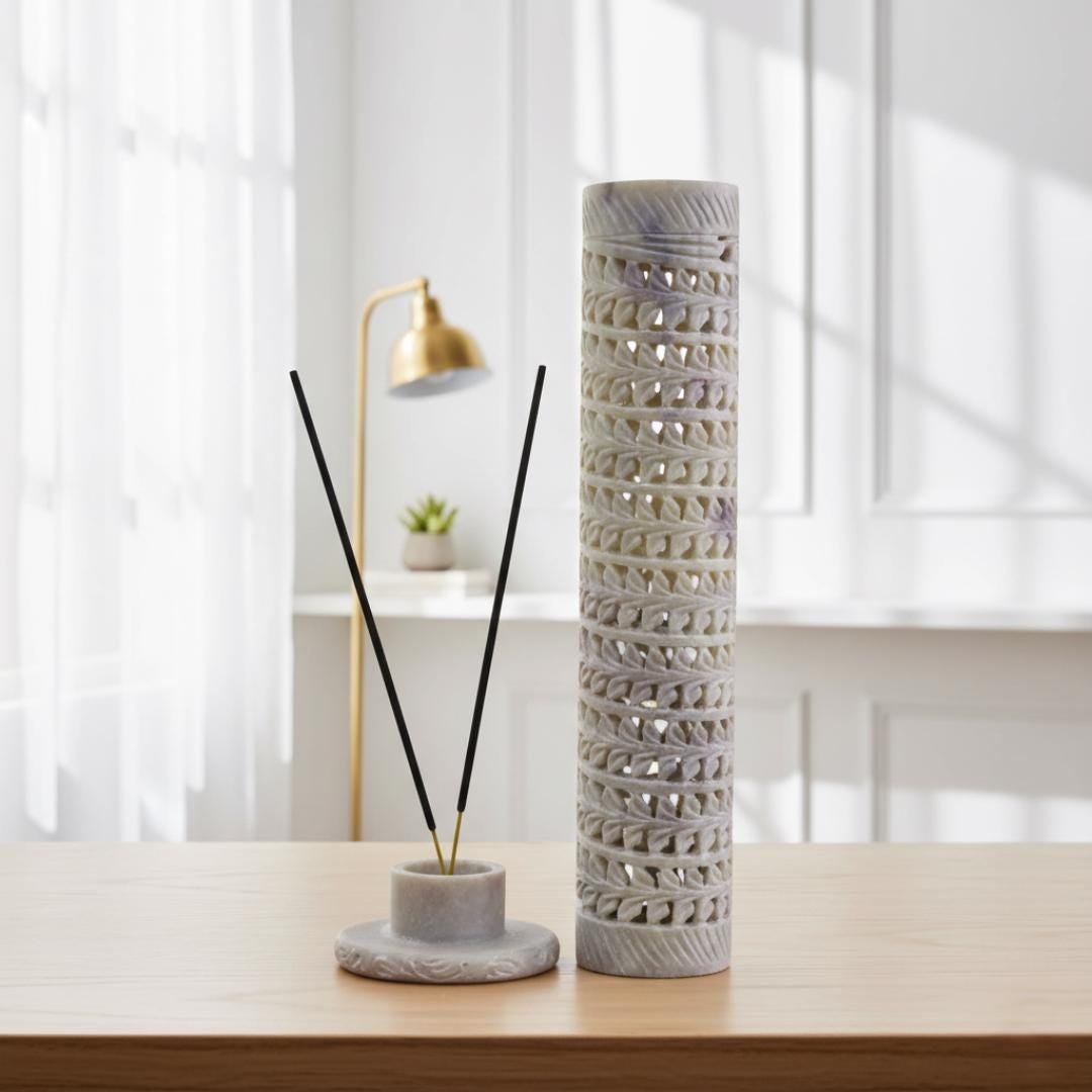 This 10.5-inch tall masterpiece is hand-carved from natural soapstone, featuring a stunning diagonal "Jali" lattice design. The intricate leaf patterns are not just decorative; they allow the soft glow of a candle or the aromatic smoke of incense to drift through your space, creating a serene and meditative atmosphere.