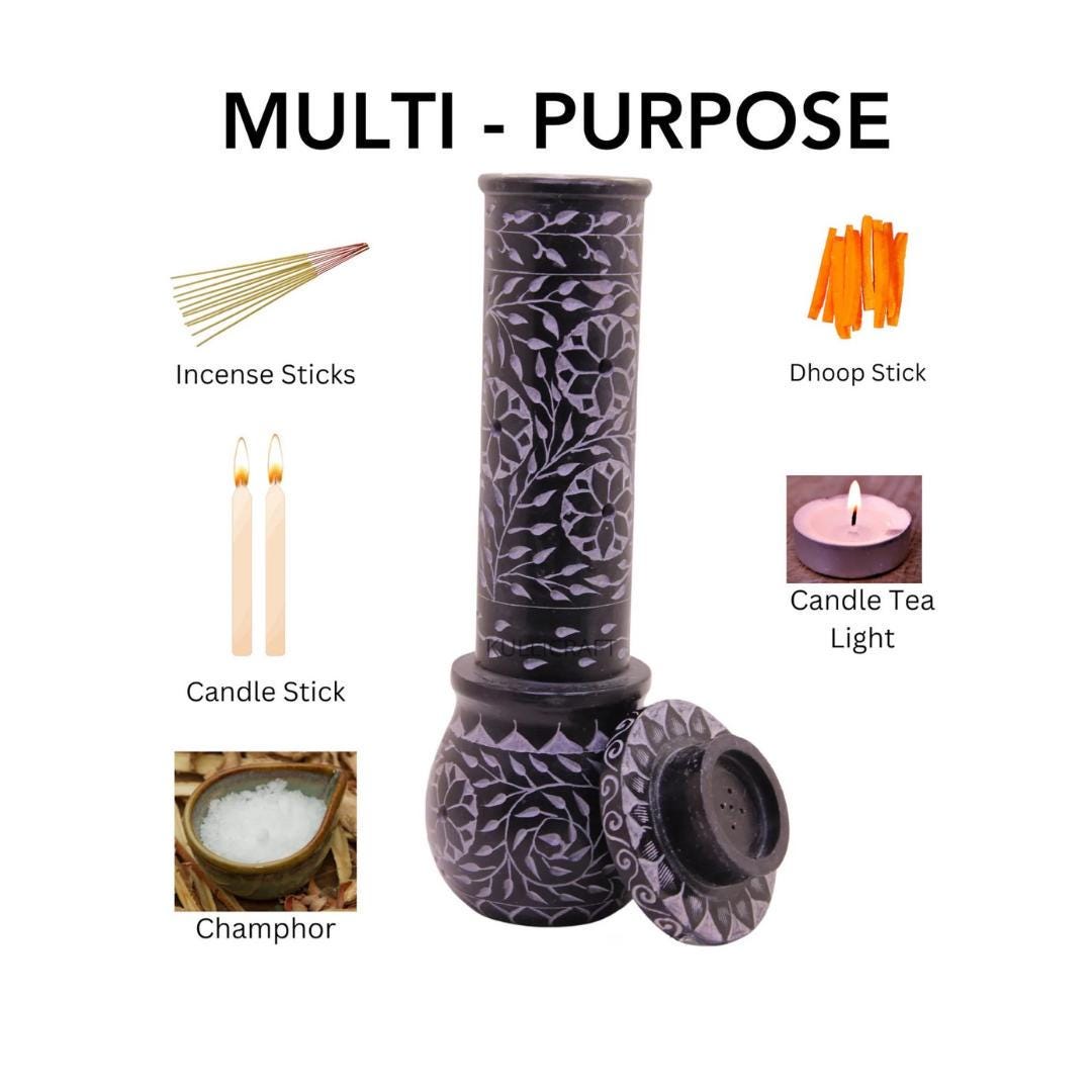 True Versatility: This "all-in-one" holder is specifically designed to handle incense sticks, dhoop sticks, tea light candles, traditional candle sticks, and even camphor.