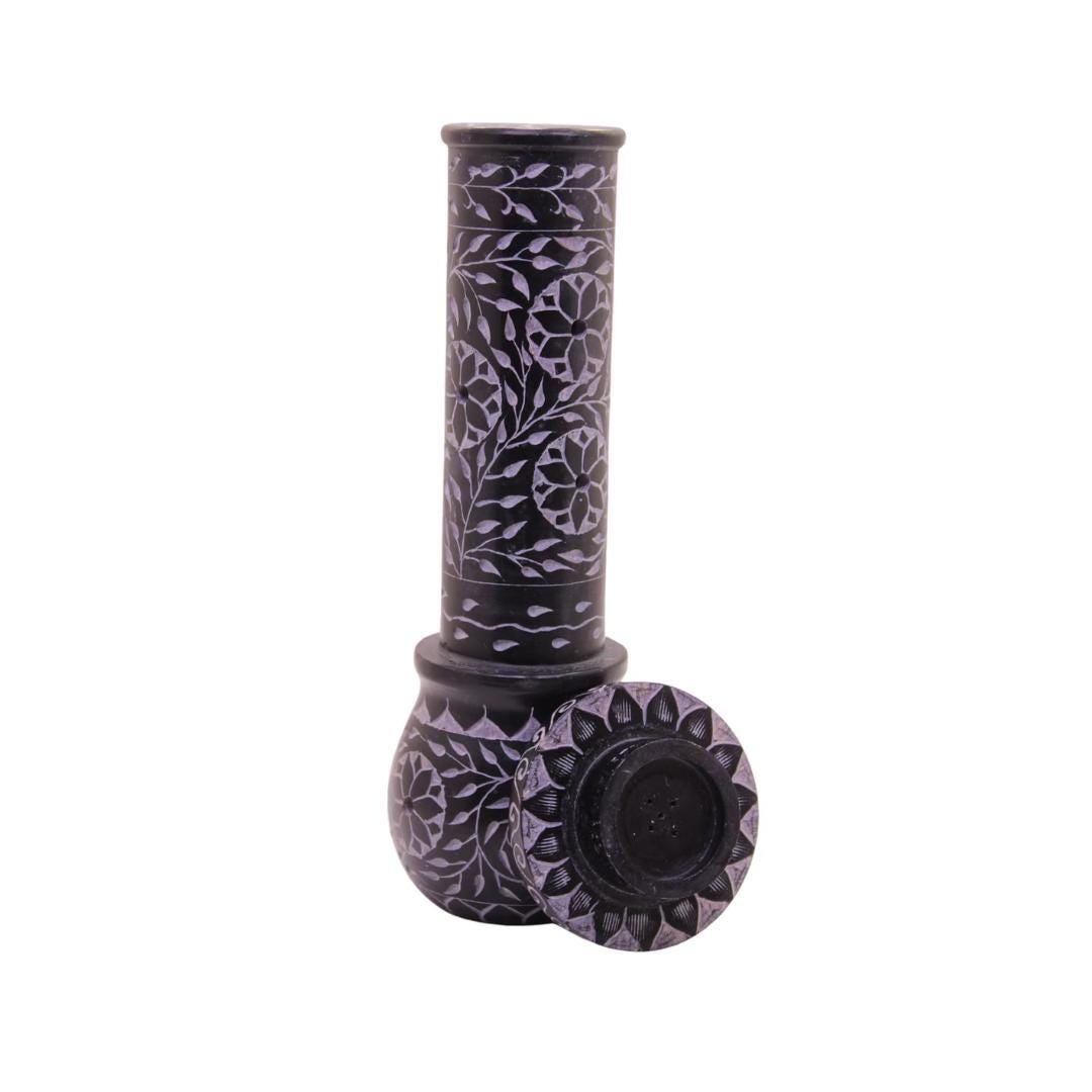 Exquisitely crafted from natural soapstone, this 10-inch burner is more than just a decorative piece—it is a versatile tool for aromatherapy, meditation, and spiritual practice. The deep charcoal finish provides a striking contrast to the delicate, hand-etched floral and leaf patterns that wrap around the tower.
