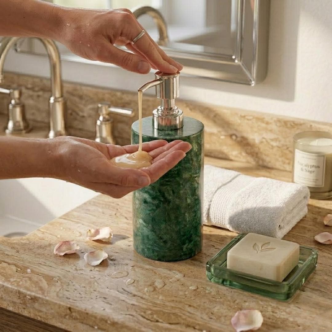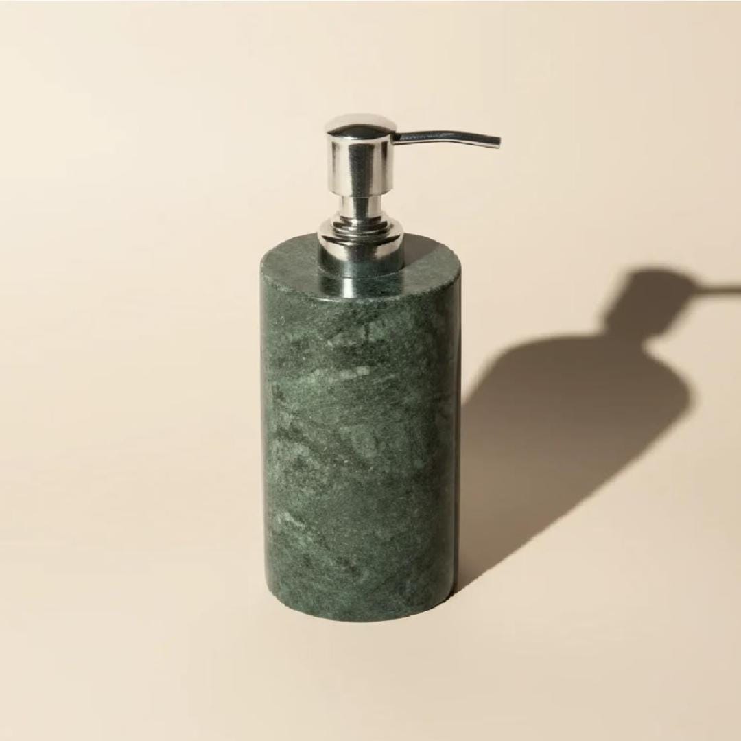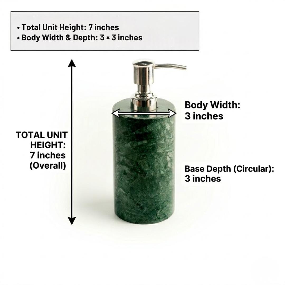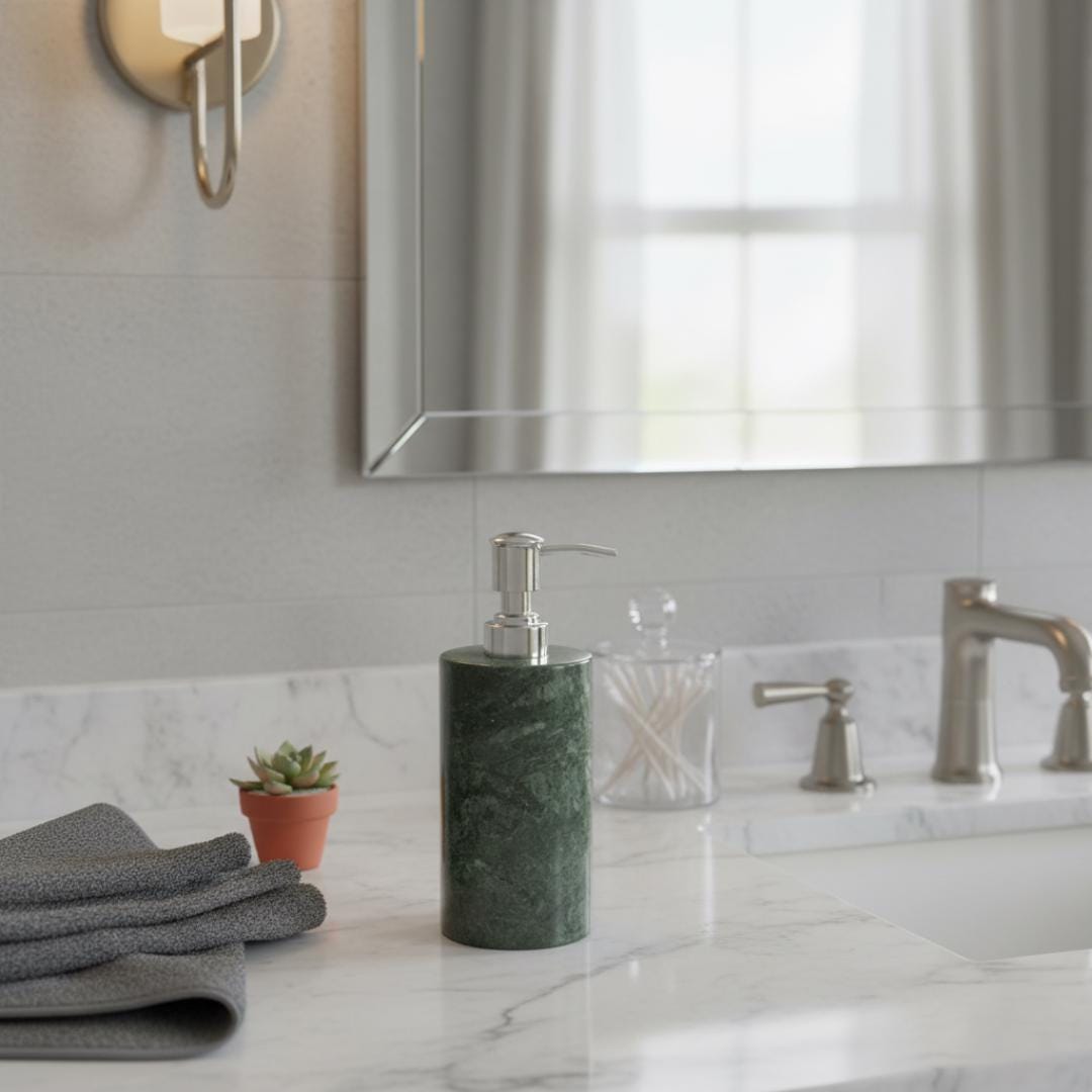 Transform your bathroom or kitchen into a sanctuary of style with our Handmade Green Marble Soap Dispenser. Crafted from a single block of premium natural stone, each piece is a unique work of art, featuring deep emerald hues and intricate natural veining that no synthetic material can replicate.