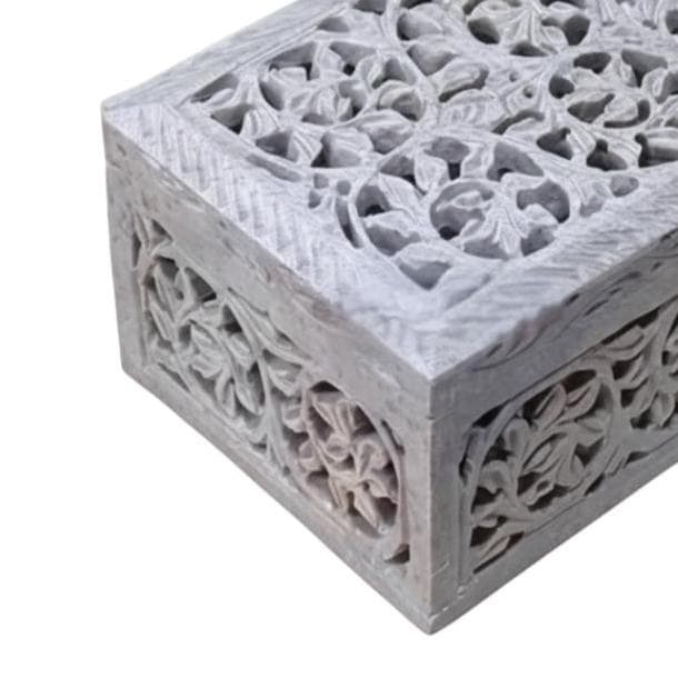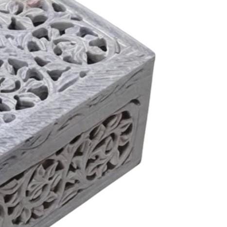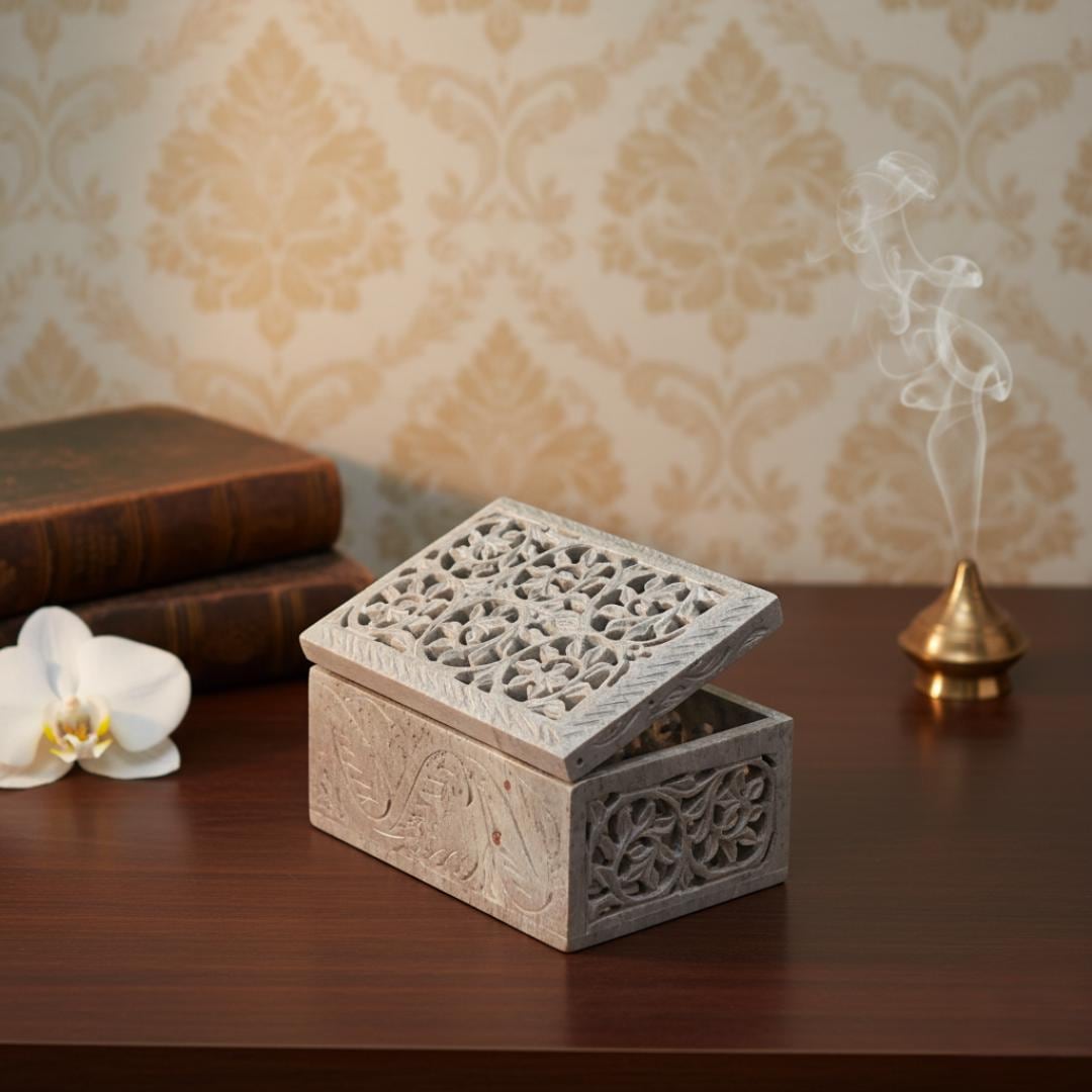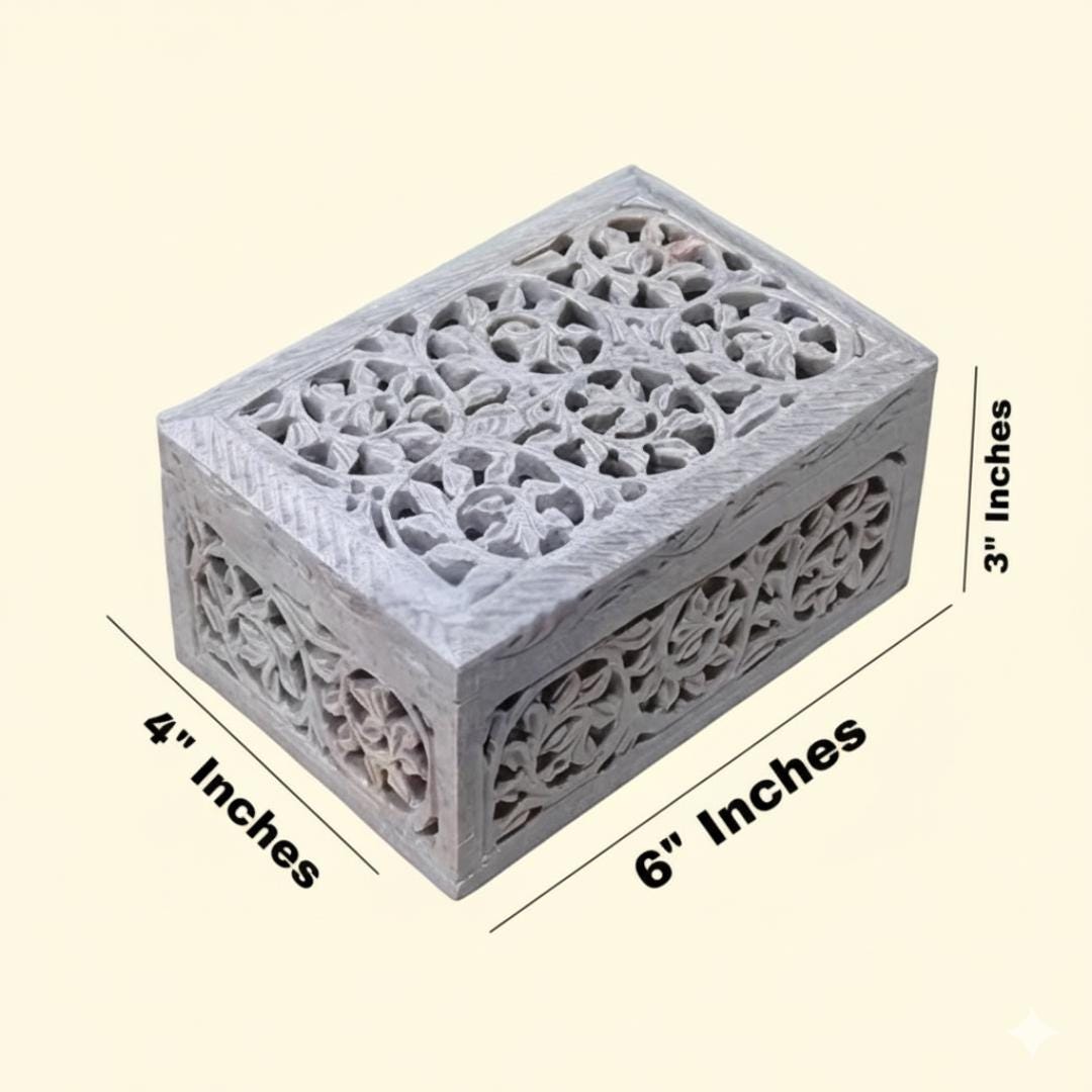 Masterful Artistry & Material Crafted from natural marble soapstone, each box features unique variations in color and grain, making your piece one-of-a-kind. The lid and sides are meticulously decorated with intricate Jali (filigree) carving, allowing for a delicate interplay of light and shadow.