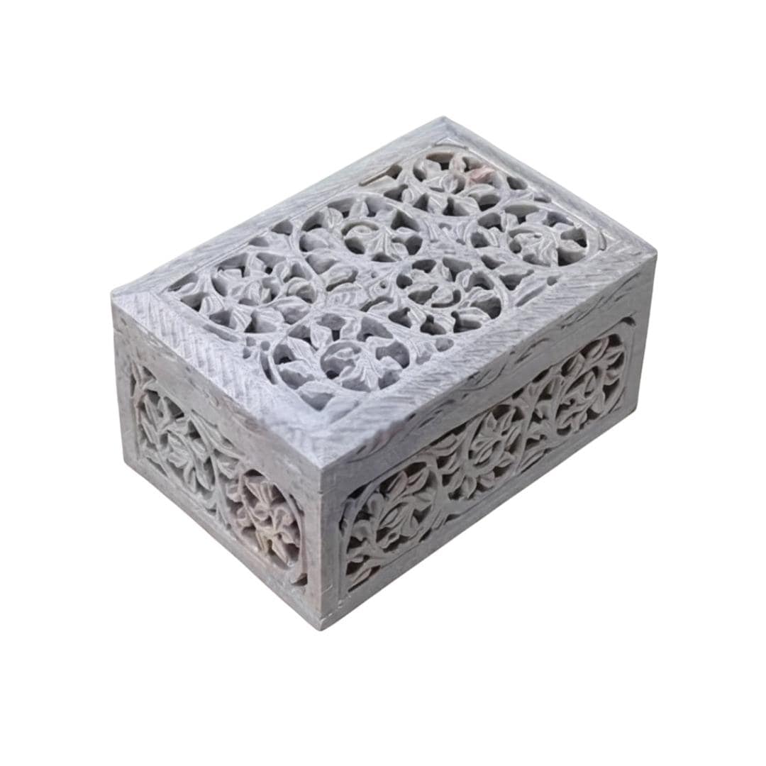 Handmade Marble Soapstone Jewelry Box 6x4x3 Inch, Floral Carved Stone Keepsake Box, Luxury Jali Work Filigree Home Decor