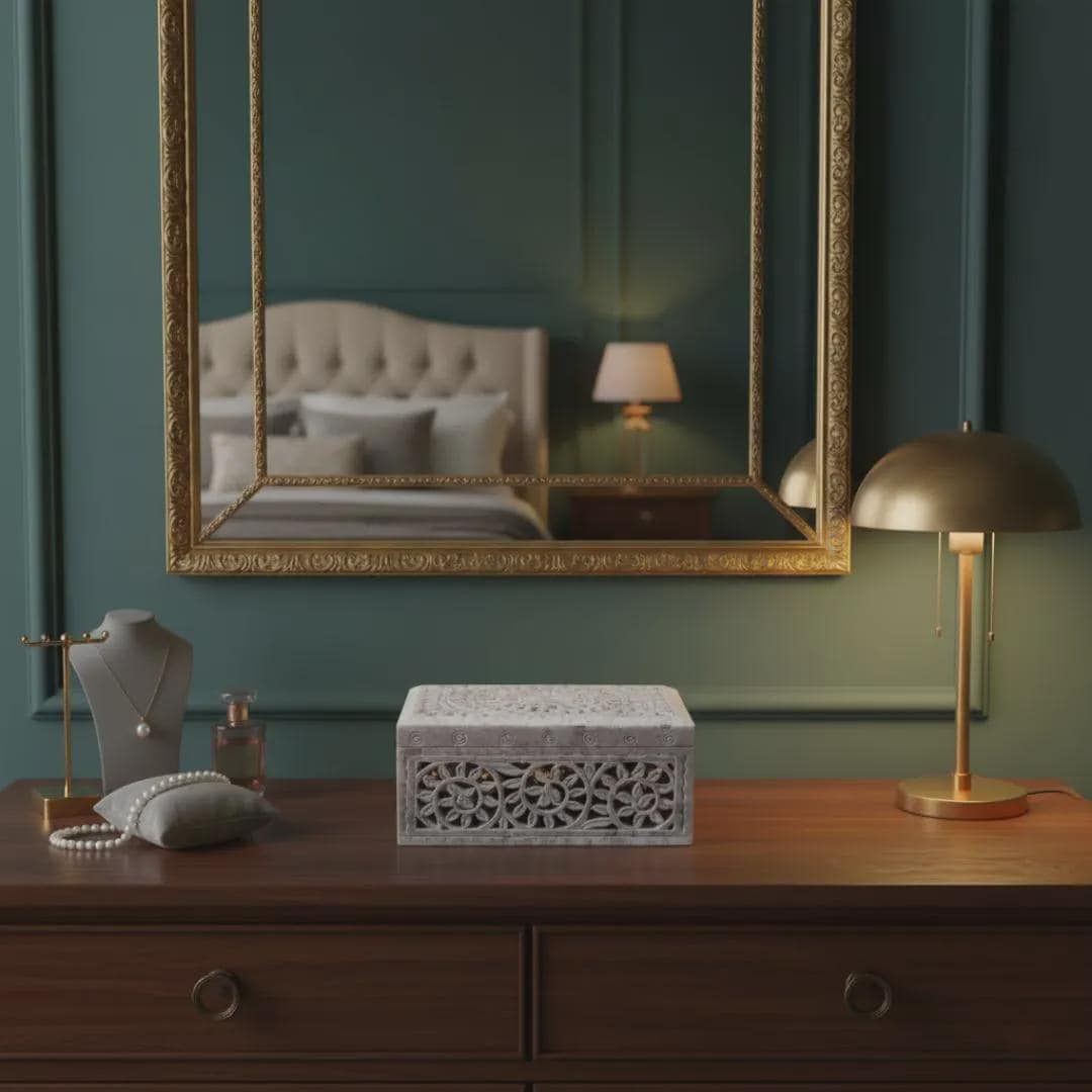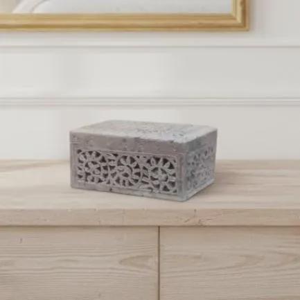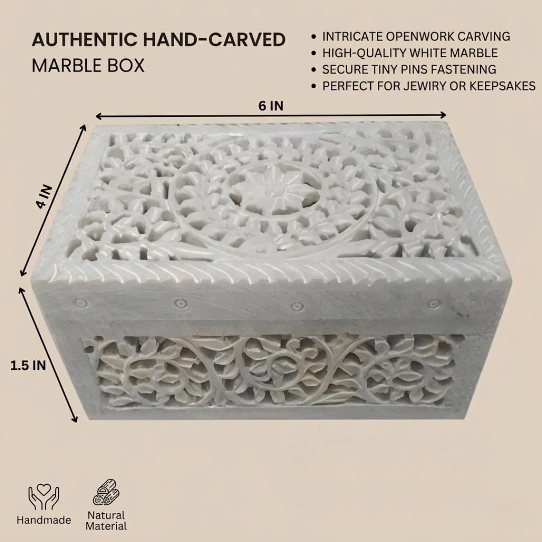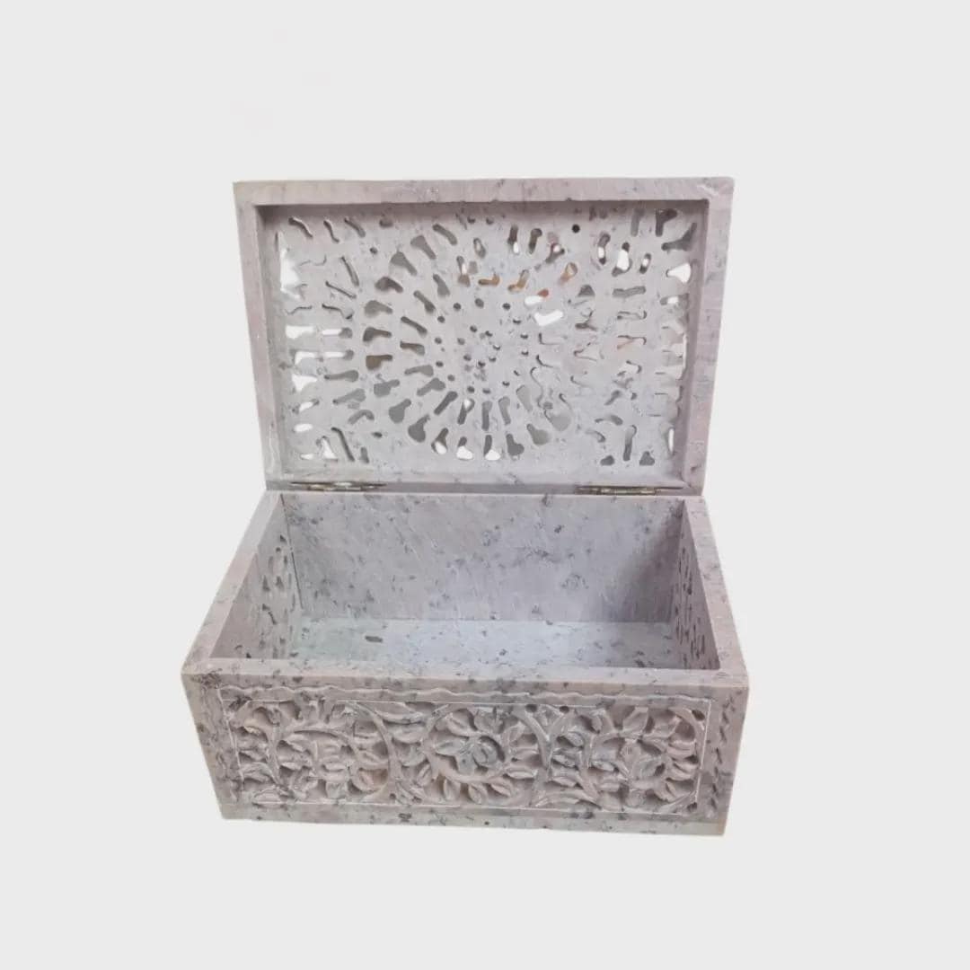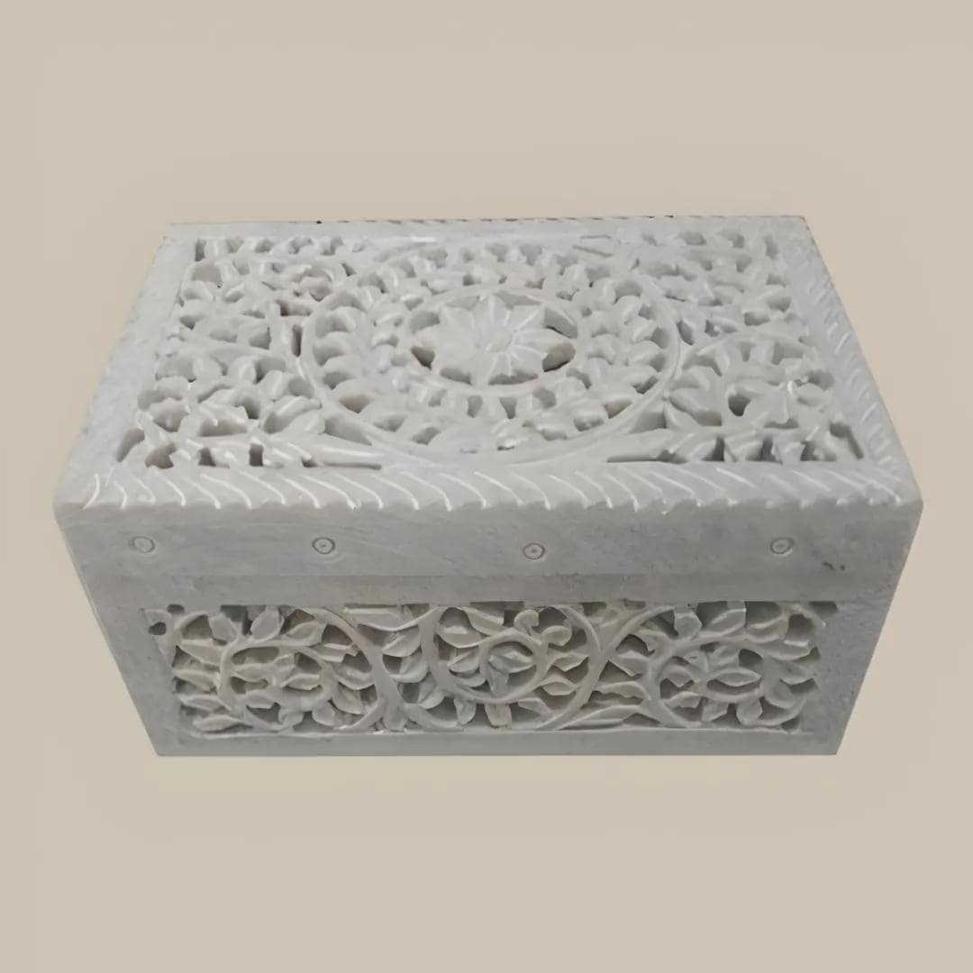 Premium Material & Artistic Detail Made from high-quality natural marble soapstone, this box is known for its smooth feel and durability. The lid and sides are decorated with intricate jali (openwork) carving, featuring a beautiful floral motif that makes it a standout piece of Indian stone art.