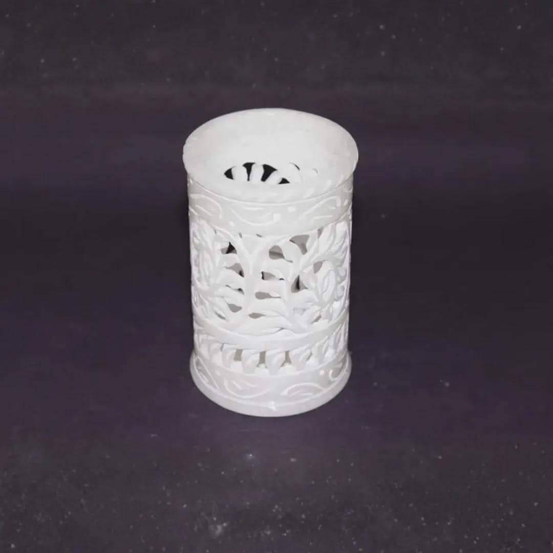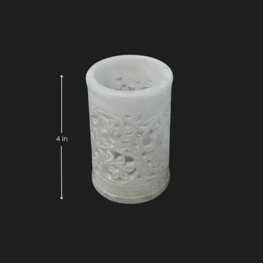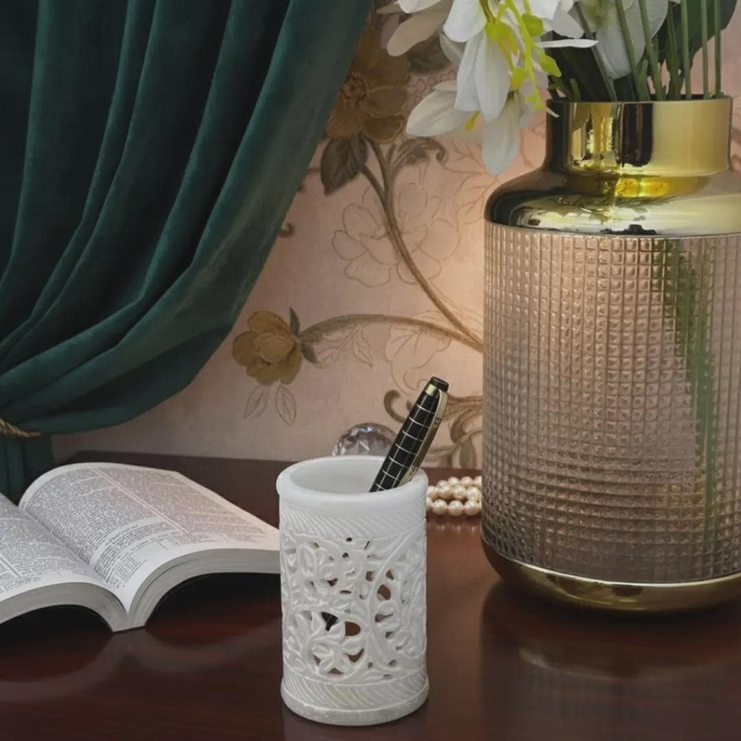 Exquisite Craftsmanship for Your Workspace Add a touch of heritage and elegance to your desk with our Hand-Carved Soapstone Jaali Holder. Meticulously crafted by skilled artisans, this piece features the traditional "Jaali" technique—an intricate floral lattice carving that allows light and air to pass through the stone. Made from natural soapstone (Gorara stone), it offers the cool, premium feel of marble with a unique matte finish.