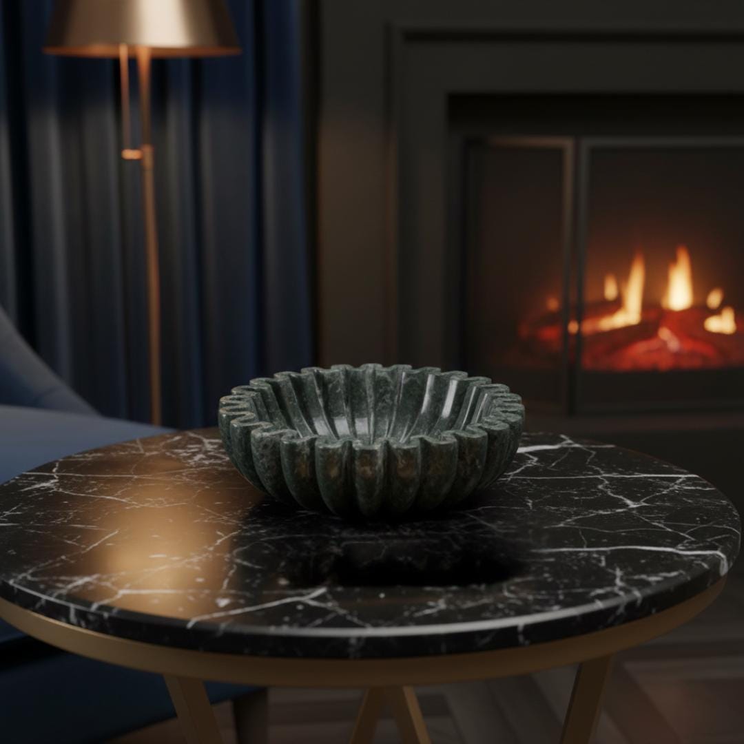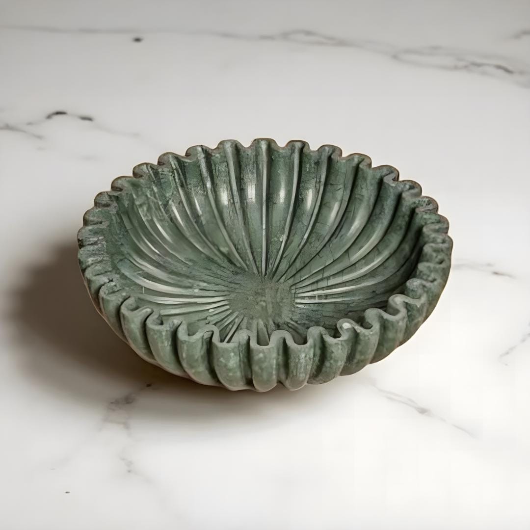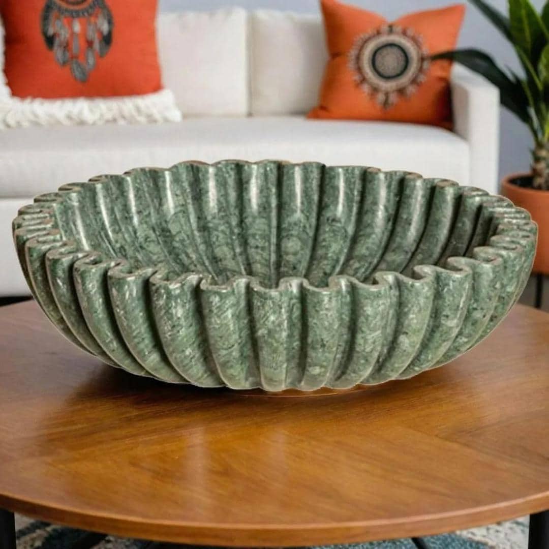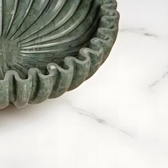 Elevate your interior decor with our stunning Handcrafted Green Marble Ruffled Bowl. Each piece is masterfully sculpted from a single block of genuine green marble, featuring an intricate ribbed texture and a soft, scalloped "ruffled" rim that mimics the graceful flow of fabric. Whether used as a functional fruit bowl or a standalone art piece, its rich green hues and natural veining bring a touch of the outdoors inside.
