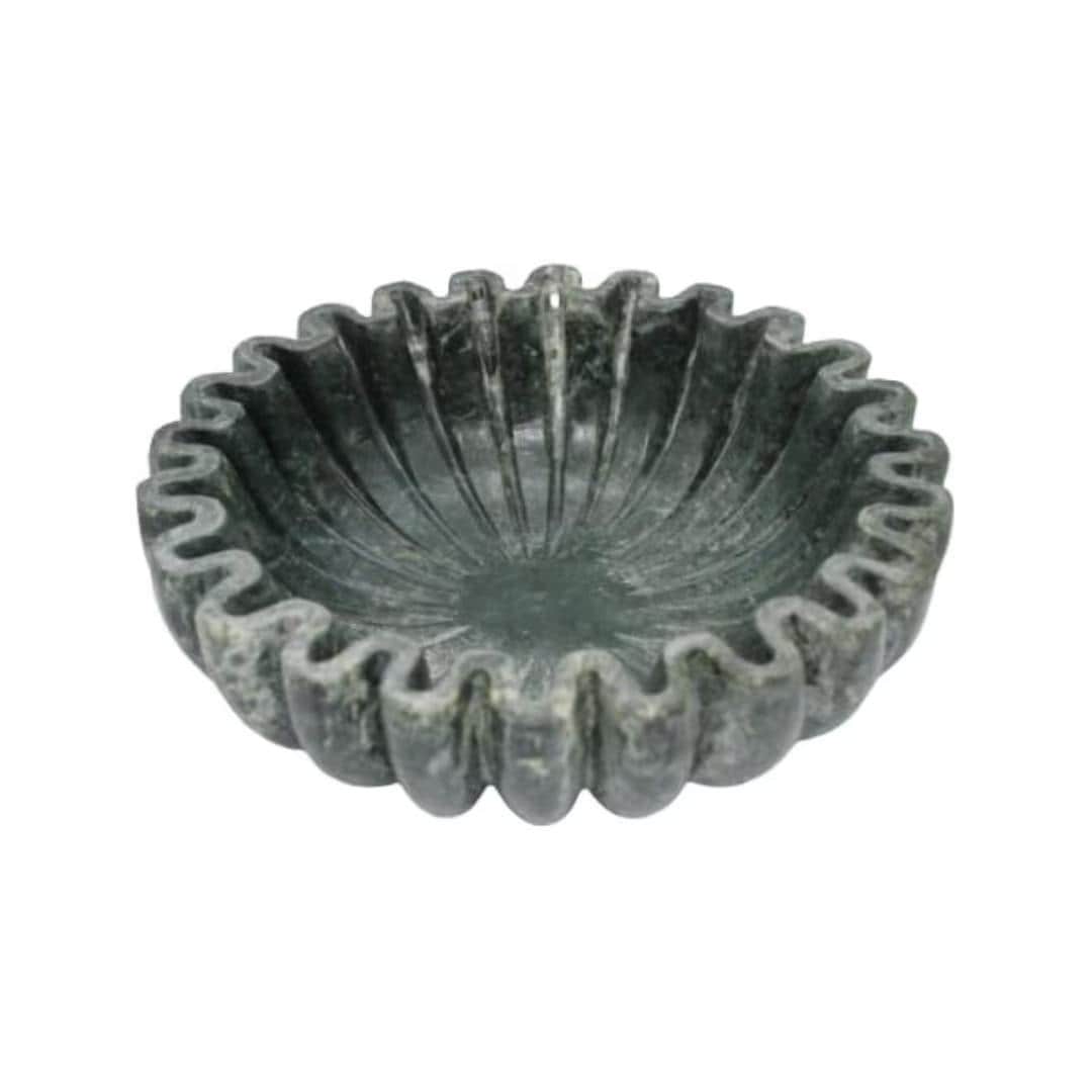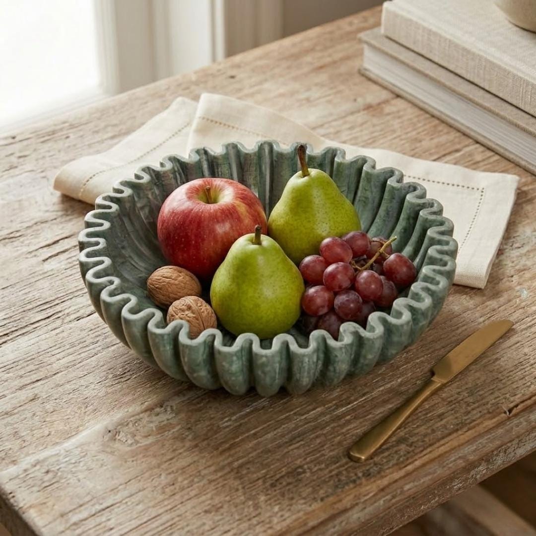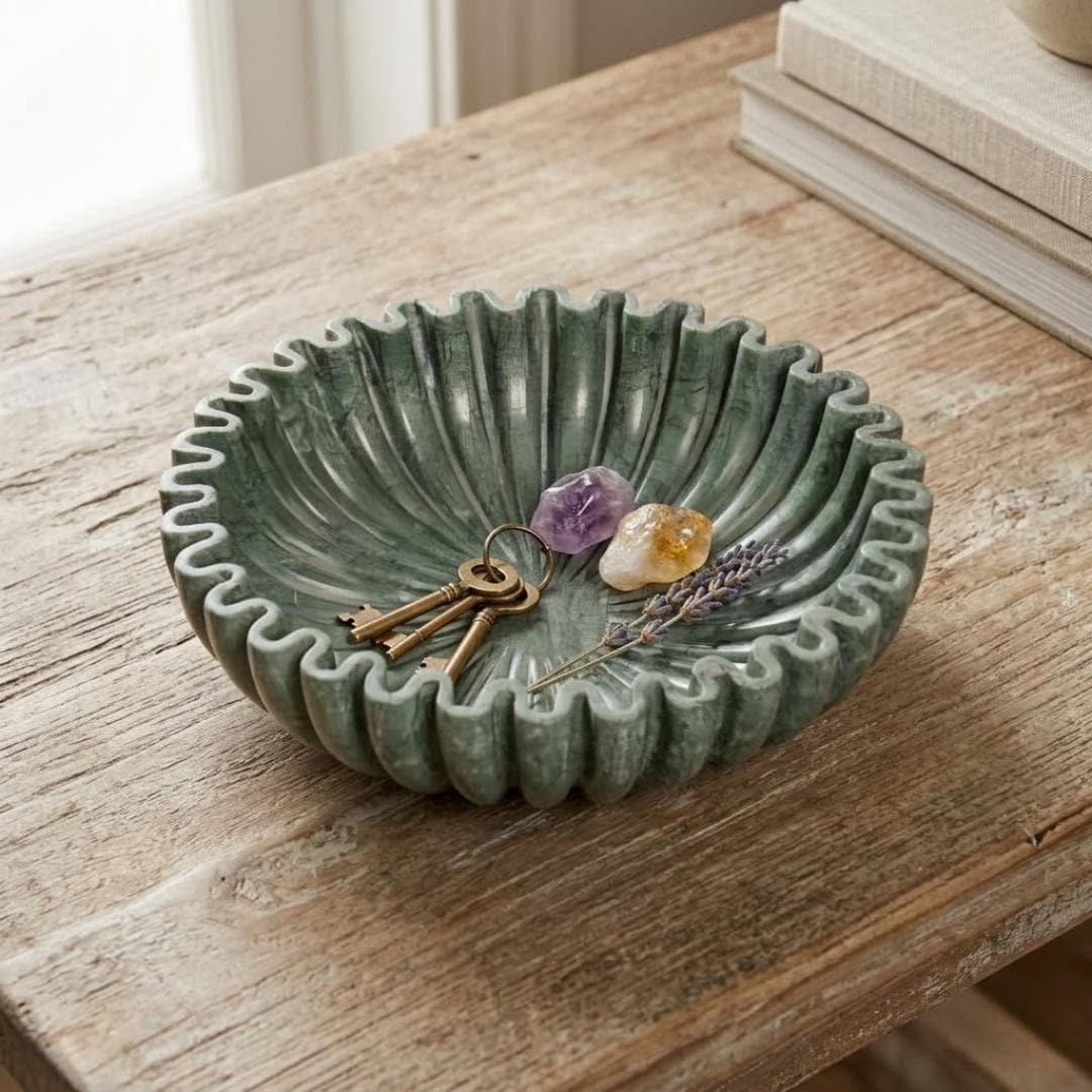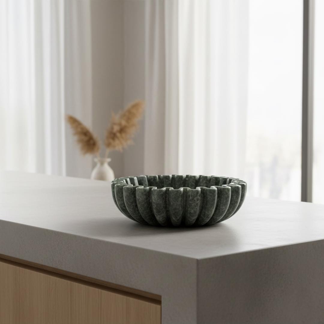 Elevate your interior decor with our stunning Handcrafted Green Marble Ruffled Bowl. Each piece is masterfully sculpted from a single block of genuine green marble, featuring an intricate ribbed texture and a soft, scalloped "ruffled" rim that mimics the graceful flow of fabric. Whether used as a functional fruit bowl or a standalone art piece, its rich green hues and natural veining bring a touch of the outdoors inside.