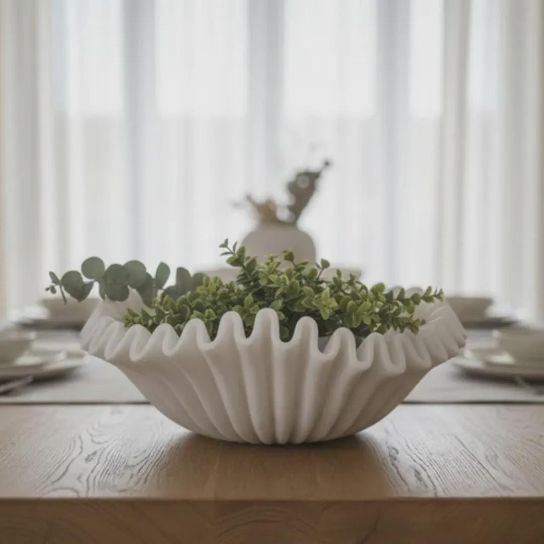 Elevate your interior styling with this breathtaking Handcrafted White Marble Ruffled Bowl. Meticulously carved from a single block of premium natural marble, this bowl features a stunning "ruffled" or scalloped edge that mimics the fluid movement of silk. Its deep, fluted ridges and smooth white finish make it a versatile masterpiece that fits perfectly in any modern, coastal, or traditional American home.
