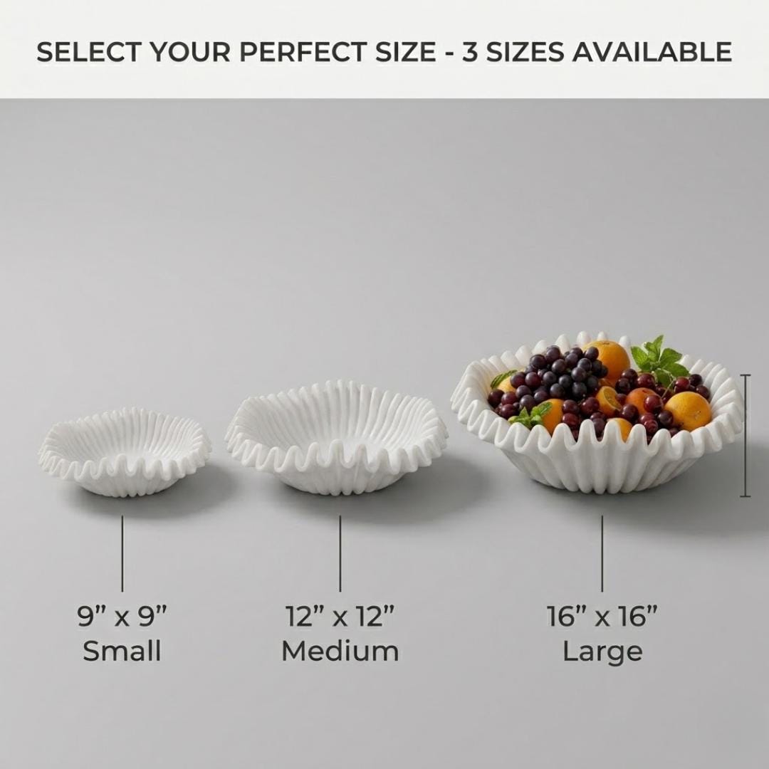 Handcrafted White Marble Ruffled Bowl - Scalloped Decorative Fruit Centerpiece, Fluted Stone Catchall, 9, 12, 16 Inches